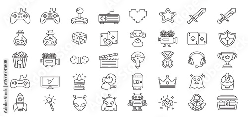 A large collection of hand-drawn doodle icons related to fantasy, gaming, and medieval themes.