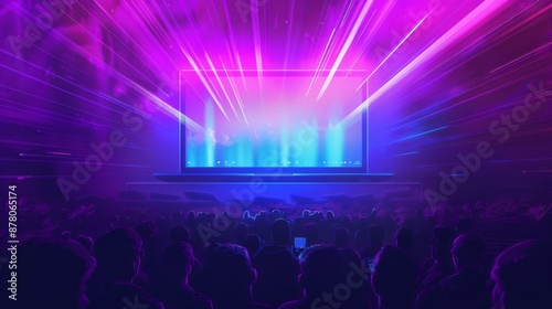 A large crowd is gathered in front of a big screen at a concert, enjoying the visual effect lighting and vibrant music at the music venue
