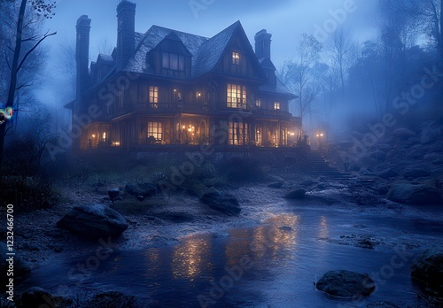 A large, dimly lit Victorian house sits on a hillside overlooking a small, dark river at twilight. The house is partially obscured by fog, and its