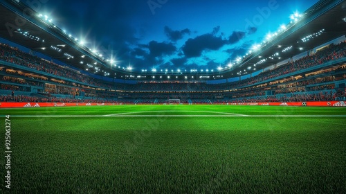 A large empty stadium with fans shouting enthusiastically before the match. Brightly lit lawn ready for the game.