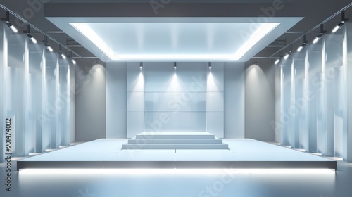 A large, empty stage with a white backdrop and a spotlight on the center