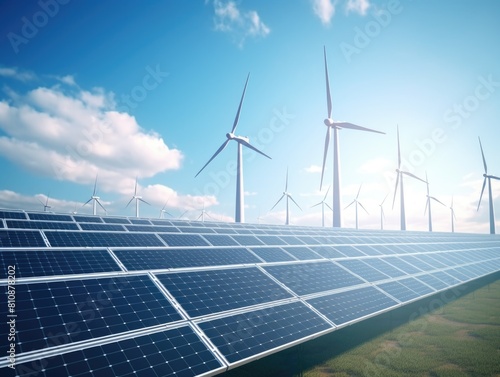 A large field of wind turbines with the sun shining on them. Scene is peaceful and serene, as the turbines are harnessing the power of the sun and wind to generate clean energy
