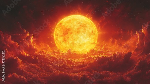 A large, fiery sun emerges from behind a layer of dark clouds in the sky.