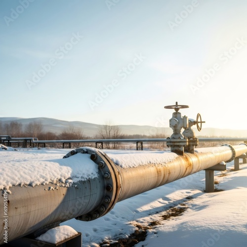 A large gas pipeline with a valve covered in light snow, running horizontally across a winter landscape. Gas system and energy concept.