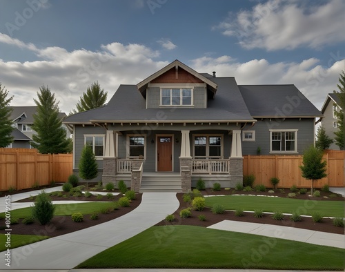 A large gray craftsman new construction house with a landscaped yard and leading pathway sidewalk.