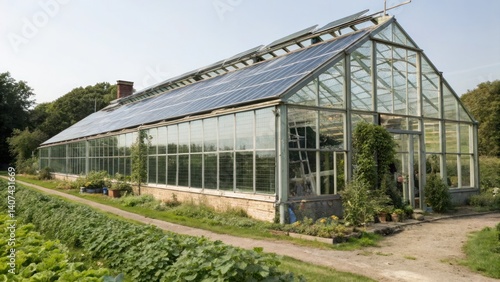 A large greenhouse with solar panels, surrounded by greenery, showcasing sustainable gardening practices in a rural setting.