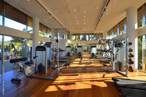 A Large Gym With Abundant Exercise Equipment, A gym with high ceilings, big mirrors and wooden floors, AI Generated