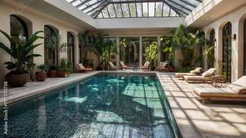 A large indoor pool with a glass ceiling and a sunlit area