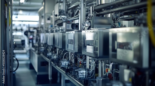 A large industrial area with many machines and pipes. Scene is industrial and mechanical