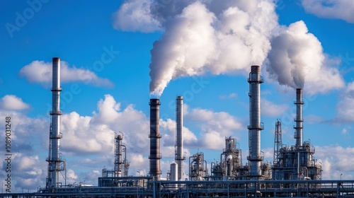 A large industrial plant with a lot of smoke coming out of it. The smoke is coming from the top of the plant, and it is a very large and tall structure. The smoke is thick and billowing