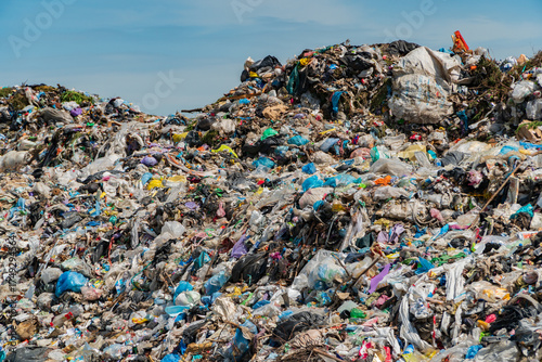 A large landfill site filled with natural and synthetic waste reflects the challenge of pollution and its effect on the environment