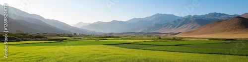 A large, open field with a mountain in the background. The sky is clear and the sun is shining brightly