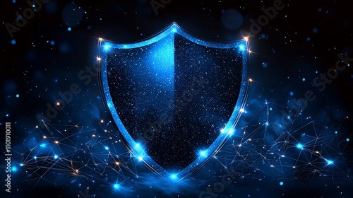 A large, ornate shield with intricate glowing patterns in silver, radiating light on a vibrant blue background