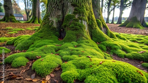 A large patch of khaki-colored moss growing in a damp and shaded area beneath a tree, shaded area, foliage, moss