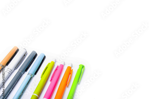 A large pile, the number of ballpoint pens of different colors on a white background. Pens for writing in close-up on a white background at an angle