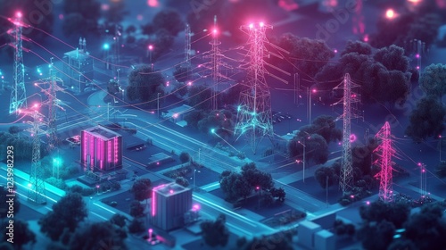 A large power grid with transformers and clean energy sources connected.