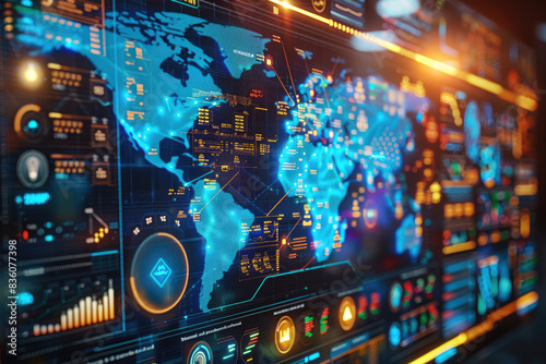 A large screen displaying a cybersecurity map, detailed data points, top view, showcasing network security and global threats