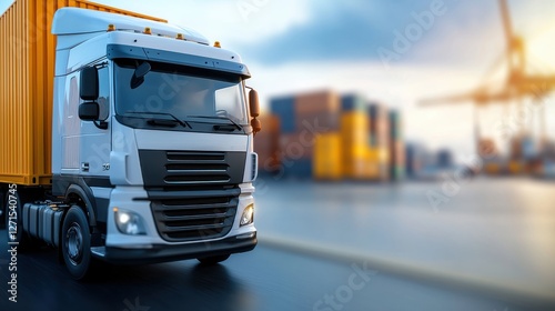 A large truck transports a shipping container through an industrial port, passing stacks of colorful containers under a bright sky.