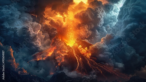 A large volcanic eruption releasing ash gas and molten lava into the sky while casting a fiery glow on the dark clouds