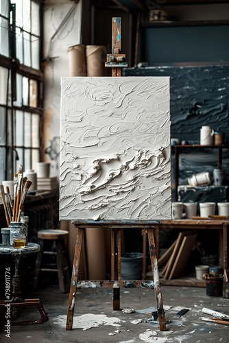 A large white and dark blue canvas painting displayed on an easel in a studio