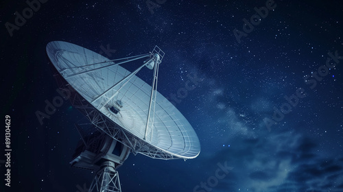 A large white satellite dish against the night sky, stars twinkling in the background. The scene is captured from an angle that highlights its size and shape, with detailed attenti