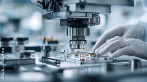 A laser wafering machine component in a semiconductor cleanroom with human hands precise anodized aluminum and matte white materials, engineering context. 3d illustration.