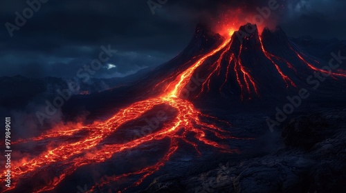 A lava flow creeping down the side of a volcano, glowing red against the dark landscape at night