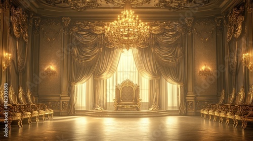 A lavish 3D scene of an opulent throne room, adorned with intricate gold detailing, velvet curtains, and a glowing golden chandelier casting a warm light across the space.