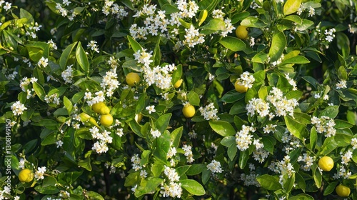 A lemon tree in bloom, with white flowers and tiny green fruits beginning to develop