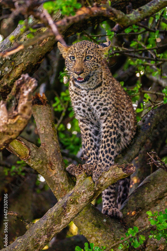 A Leopard (Panthera pardus) sitting in a tree in the Maasai Mara National Reserve, Kenya