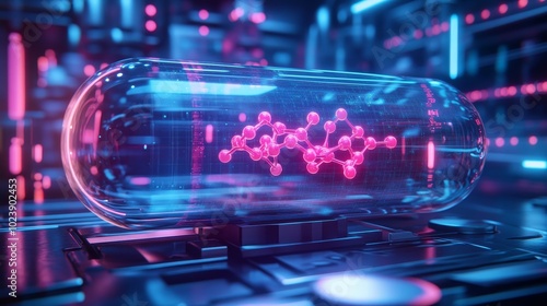 A levitating neon-lit capsule, surrounded by 3D holograms of molecular structures, projecting a magical futuristic cure on a sleek metallic platform