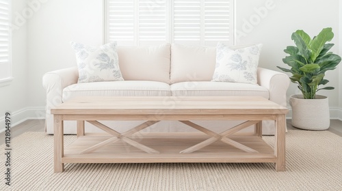 A Light and Airy Living Room with a Simple X-Shaped Coffee Table and a Cozy Sofa