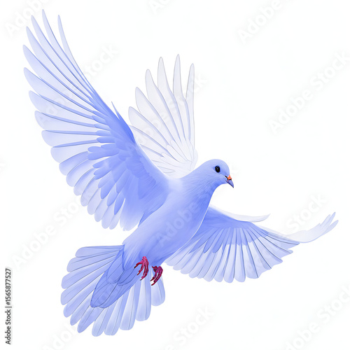 A light blue dove with wings spread wide in flight against a plain white background, isolated view