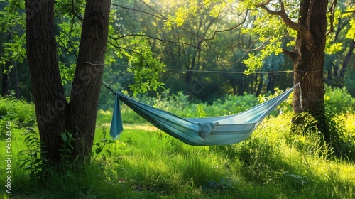 A light blue hammock strung between two trees, inviting relaxation on a sunny day