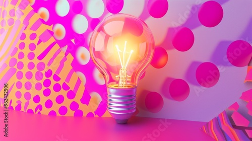 A light bulb glows warmly against a backdrop of vibrant abstract patterns in pink, orange, and purple. The combination of the bulb's warm light and the dynamic patterns creates an energetic and modern