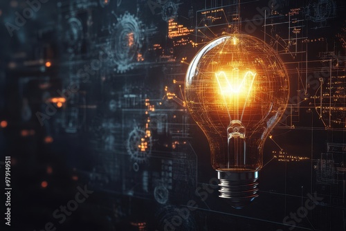 A light bulb is lit up in a dark room with a lot of computer code and circuitry and it is surrounded by a lot of complex and intricate patterns