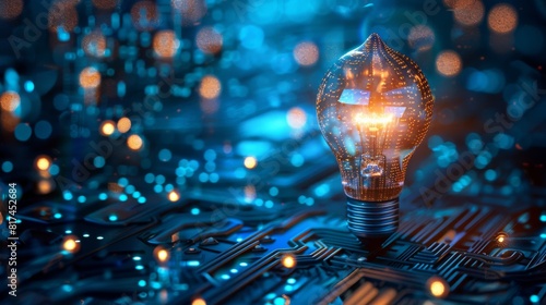 A light bulb is lit up on a circuit board