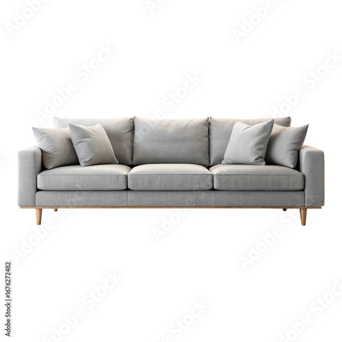 A light gray sofa with pillows and wooden legs isolated against a black background in a studio shot created with generated ai
