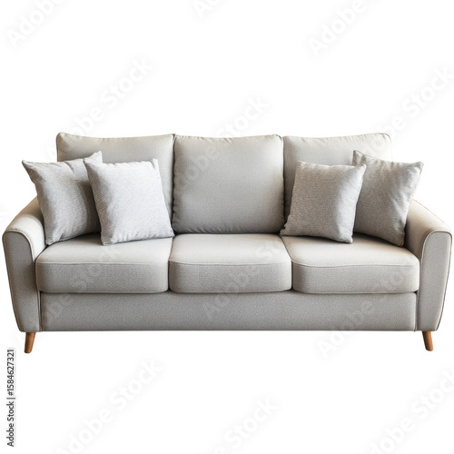 A light gray sofa with pillows, isolated on a white background. A detailed photograph, in PNG file format.