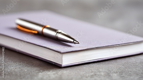 A light purple notebook with a metallic pen resting on a gray surface.
