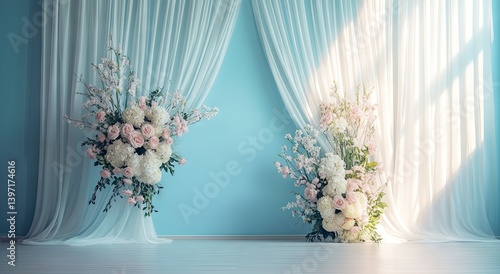 A light-blue backdrop adorned with delicate floral arrangements and sheer curtains.