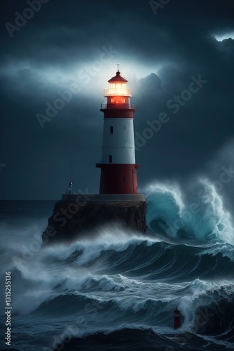 A lighthouse on the shore of a stormy sea in cloudy weather in the evening