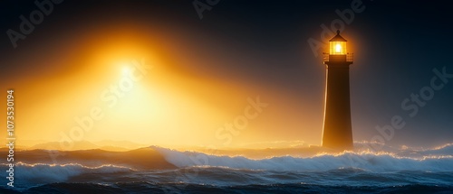 A lighthouse stands resilient against turbulent waves, illuminated by a warm glow.