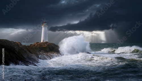 a lighthouse stands tall on rocky shores illuminating the darkened sea amidst crashing waves and ominous clouds providing guidance for vessels during a fierce storm