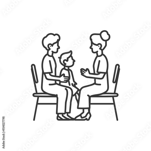 A line drawing of two adults sitting on chairs facing each other with a child sitting between them