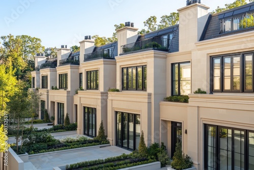 A line of elegant townhouses with neutral beige walls, dark-framed windows, and small rooftop gardens
