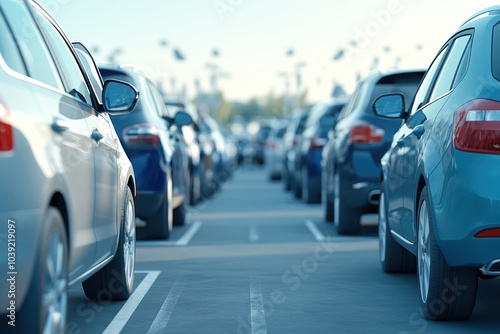A lined view of parked cars in a spacious lot, showcasing different colors and models under clear skies.