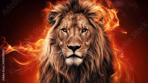 A lion with glowing fire flames and smoke on burning background. Brave, Proud concepts.
