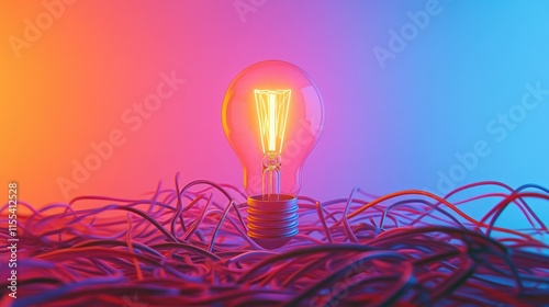 A lit bulb floating amidst a network of colorful wires on a sleek gradient background, embodying creativity