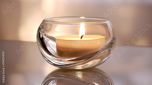 A lit candle in a glass holder, creating a warm and inviting ambiance.